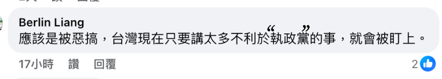 对此,沈政男表示,自己写了十几年脸书,发表了几千篇帖文,竟然就这样被没收,让人不免有政治方面的联想。岛内网友也痛批:“台湾现在只要讲太多不利于‘执政党’的事,就会被盯上。”“实话说太多,民进党不喜欢。”“真的诈欺账号去检举,脸书还说没有问题!”